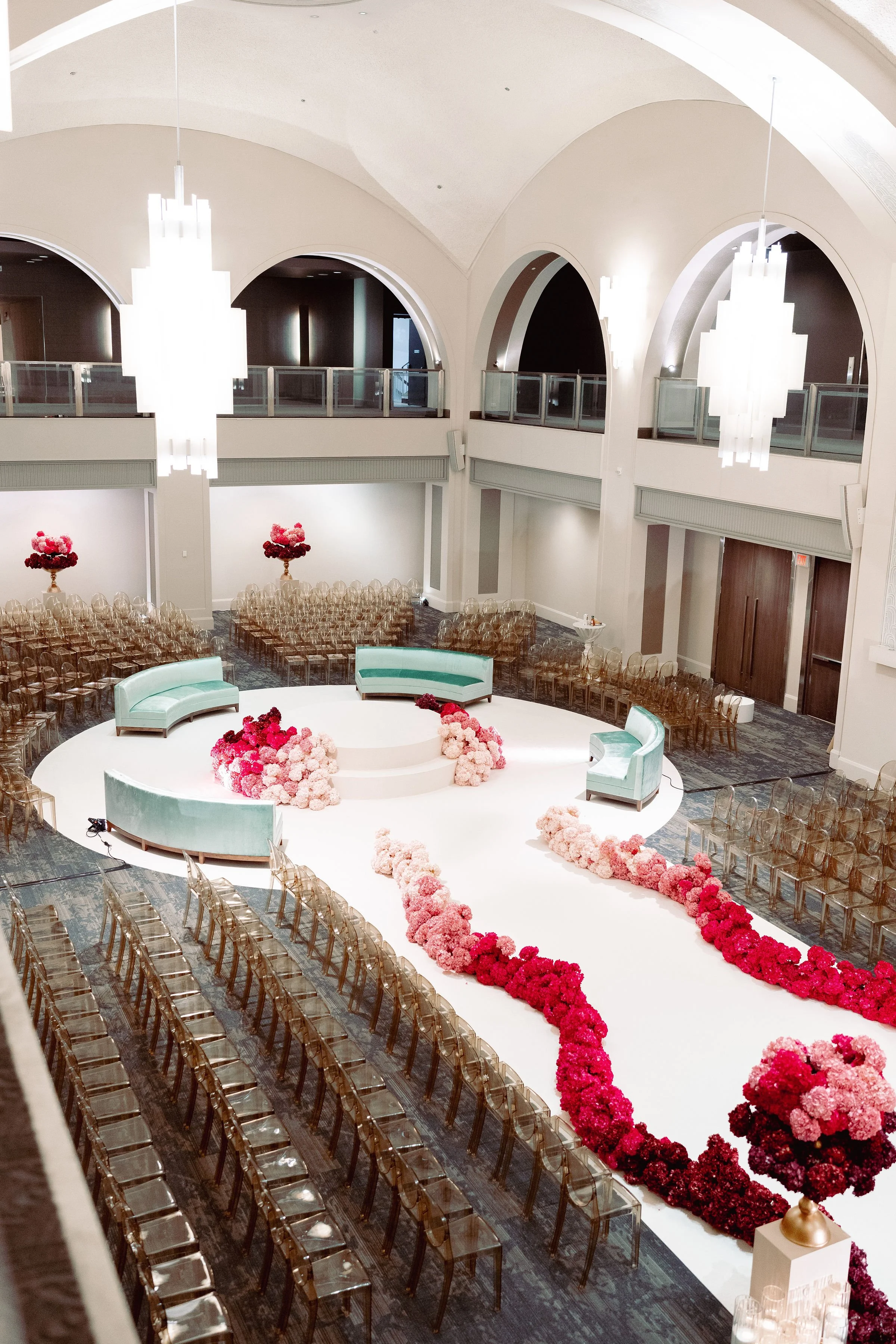 Arcadian Court has wide arches, soaring ceilings, and clean symmetry — a space that naturally invites scale. To honour that, we created a 30-foot aisle installation built entirely from hydrangeas in three tones: soft blush, vibrant fuchsia, and deep burgundy. The gradient effect wrapped around the aisle like flowing colour, guiding guests toward the circular stage.