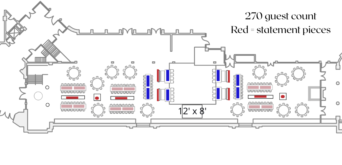 Liberty Grand, on the other hand, is built for scale. It can comfortably accommodate larger weddings, and we’ve personally designed receptions there for 270+ guests—with the room still feeling grand, spacious, and high-energy.