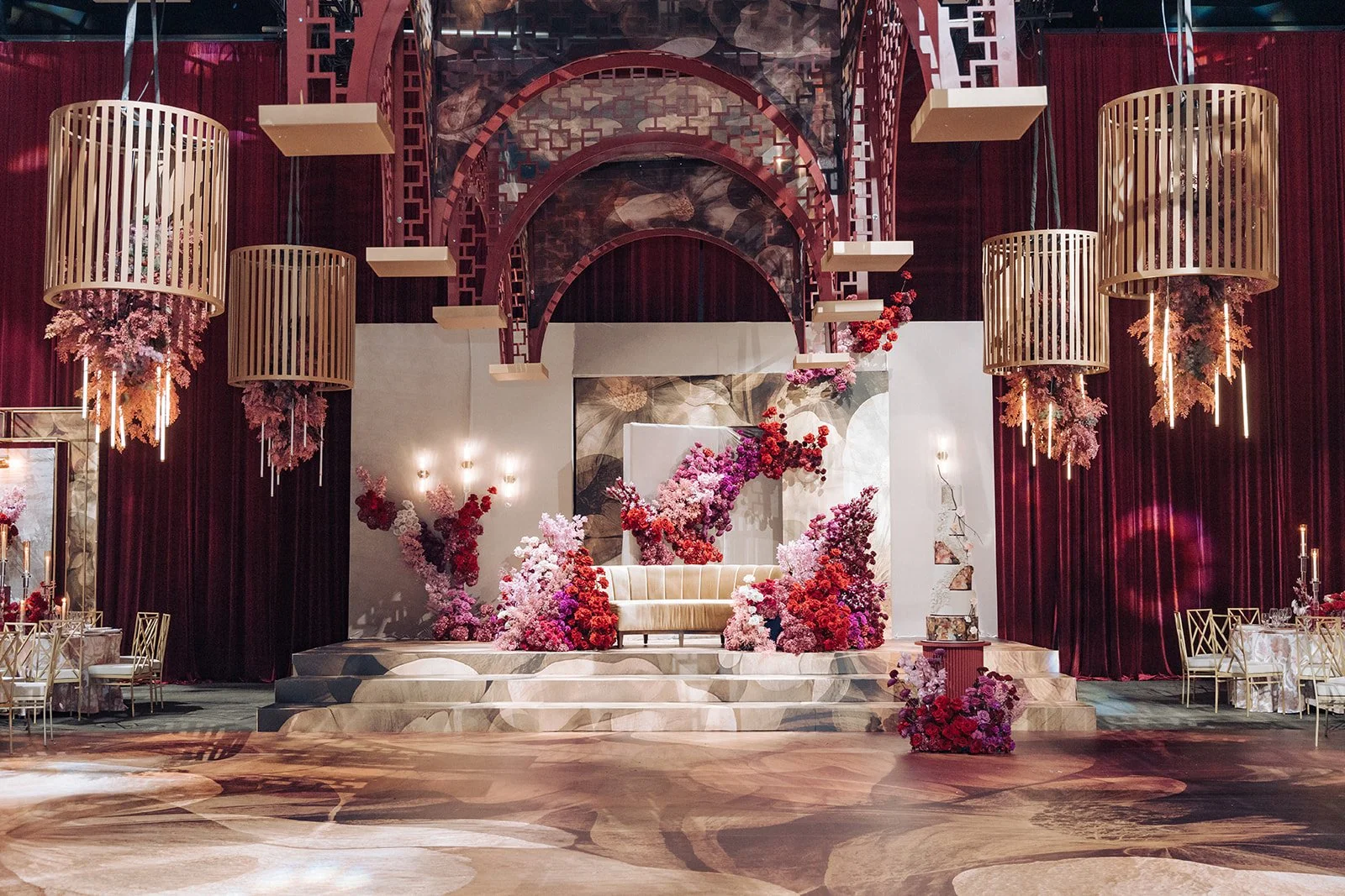Ethereal Creators designed Harneet and Gary's 526-guest wedding under the Red Dynasty concept — a full-environment transformation featuring a custom rigged ceiling installation with bespoke drum chandeliers, floor-to-ceiling crimson velvet draping, a custom-printed vinyl dance floor, a built sweetheart stage with large-scale art backdrop, and a fully wrapped bar. A single circular botanical motif was printed across every surface of the room for visual cohesion.