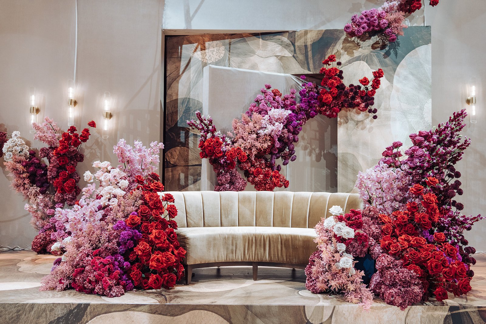 Ethereal Creators designed a raised platform stage with a large-scale custom art backdrop — an abstract composition anchored by the botanical medallion motif, printed in deep crimson and blush tones. Flanking the stage on both sides, fresh floral cascades in crimson, pink, and blush poured from floor to ceiling height, framing the couple in a wall of blooms. An ivory sofa sat centre stage, providing an intimate focal point inside the grandeur.