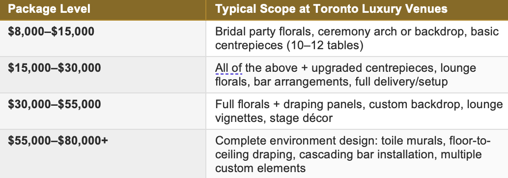 For a deeper breakdown of what flowers and décor actually cost at specific Toronto venues, read our dedicated guide: