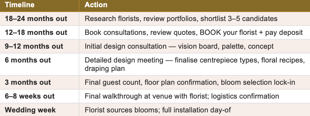 Toronto's best wedding florists — particularly those who handle full installations at luxury venues — fill their Saturdays quickly. Peak wedding season (May–June and September–October) books 12–18 months out. Here is a realistic booking timeline: