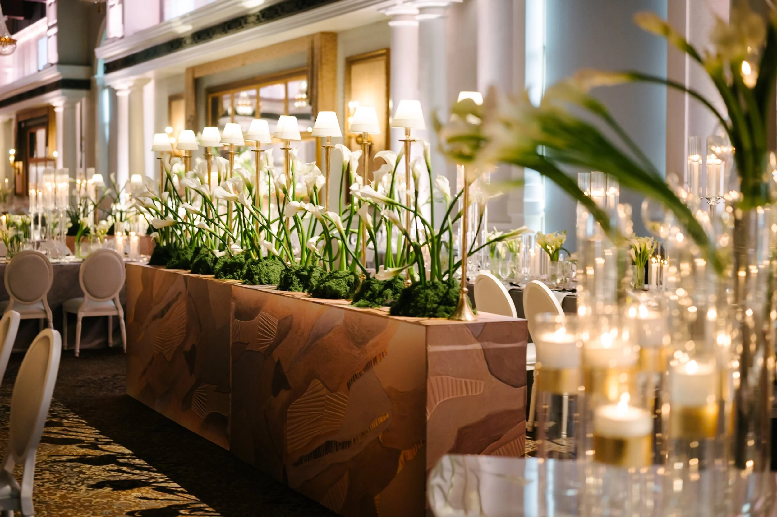 Long mirrored tables reflected hundreds of flickering candles, and every corner was softly illuminated by the oversized custom lamps that framed the space. The dance floor lounge, thoughtfully placed for social flow, became a gathering point that balanced intimacy with scale.