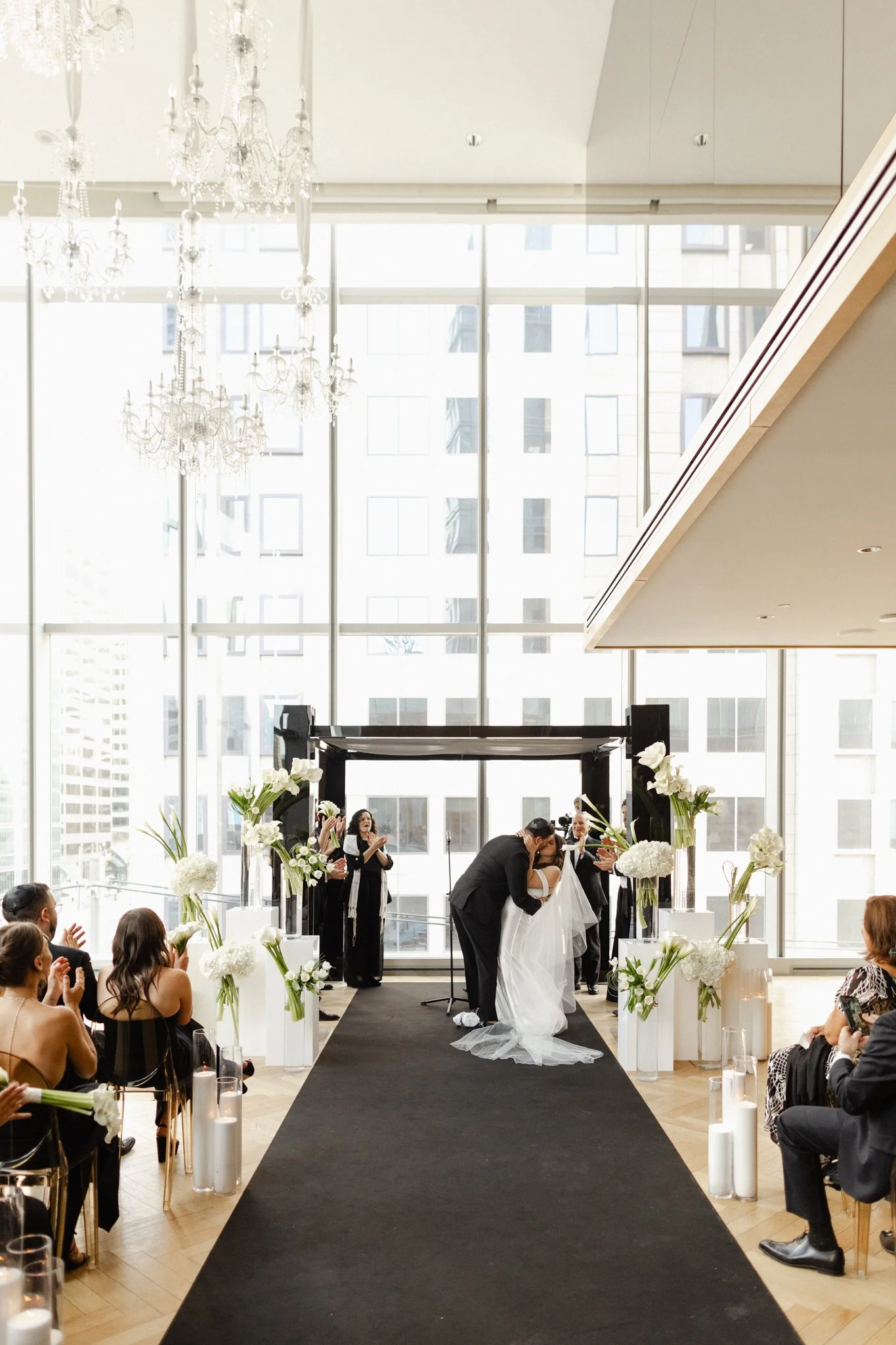 A modern Jewish wedding at Shangri-La Toronto filled with black and white elegance, a custom chuppah, sculptural florals, and candlelit reception design by Ethereal Creators.