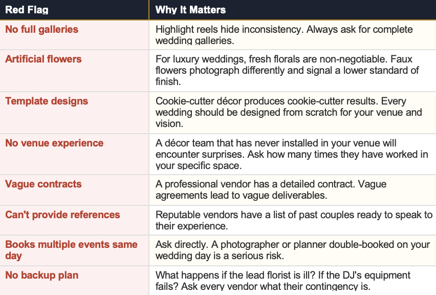 These are the warning signs we have observed across 100+ Toronto weddings. None of them are automatic disqualifiers — context matters — but each one is worth investigating before you sign a contract.