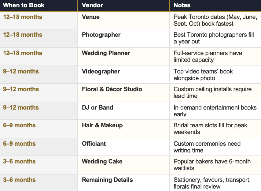 Venue: 12 to 18 months. Photographer and videographer: 12 to 18 months for top photographers. Wedding planner: 12 to 18 months. Floral and décor studio: 9 to 12 months for full custom work. DJ or band: 9 to 12 months. Hair and makeup: 6 to 9 months. Officiant: 6 to 9 months. Wedding cake: 3 to 6 months. Popular Toronto wedding weekends in May, June, September, and October book earliest.