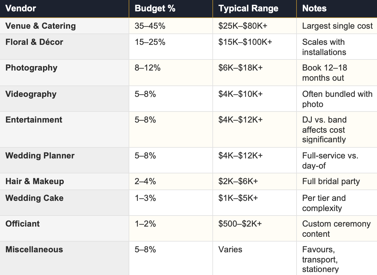 This is a general guide for luxury Toronto weddings. Every couple's priorities differ — some allocate more to photography, others to entertainment or décor. The percentages below reflect what Ethereal Creators observes across the weddings we design.